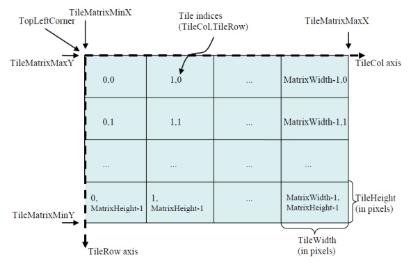 瓦片矩阵中的每个瓦片由瓦片的行(TileRow)列(TileCol)值进行标识,行列值分别从瓦片矩阵左上角点所在的瓦片开始算起,起始行列值是(0,0),依次向下向右增加,如图2所示。