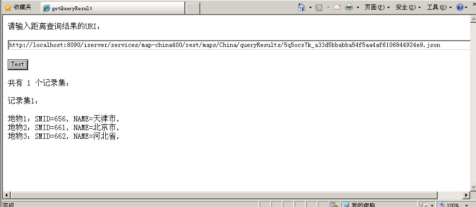 对 queryResult 资源执行 GET 请求,可以获取其中的信息(参见 REST API 中 queryResult 资源页面)。以距离查询中查询的结果为例,其中包含属性信息和几何对象信息,获取查询结果的数目,并把所有字段的值列出来,代码如下:
