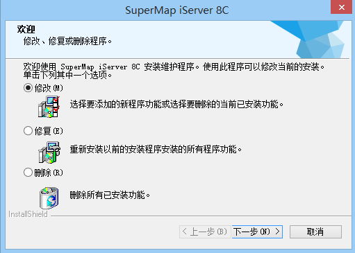 (1) 当系统已经安装了 SuperMap iServer 产品之后,将 SuperMap iServer 产品安装光盘 CD1放入 CD-ROM 驱动器(如 G:),如果系统允许自动运行,将会出现 SuperMap iServer 修改界面,如下图所示:
