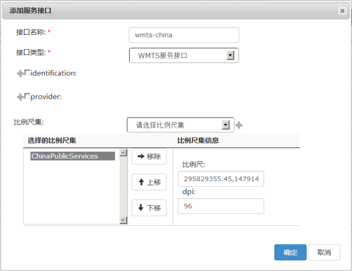 除设定接口名称,接口类型外,还要指定服务标识信息、服务提供者信息以及比例尺集信息(比例尺信息、屏幕分辨率(DPI))等参数,其中,接口名称、接口类型 是必填参数。服务标识信息包括服务标题、描述、关键词、费用、访问限制、服务类型、服务版本等内容;服务供应者信息包括供应者名称、网址、服务联系信息等内容;知名比例尺集参数是 WMTS 标准定义的通用的比例尺集,有六个可选值:GlobalCRS84Scale、GlobalCRS84Pixel、GoogleMapsCompatible、GoogleCRS84Quad 、 ChinaPublicServices 和 Custom,详见WellknownScale。SuperMap iServer 支持用户在 WMTS 接口中设置自定义比例尺集。
