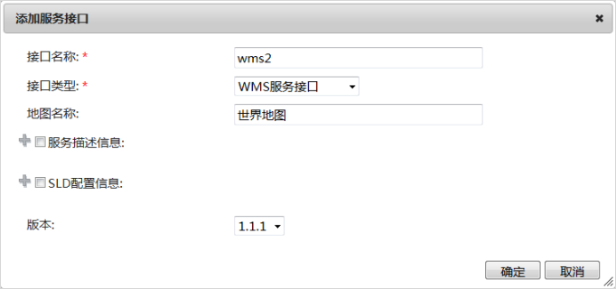 下面是添加 WMS 服务接口的例子。用户在设定好参数后,点击确定,即可完成此接口的添加。用户添加完成的服务接口会显示在服务接口的首页面上。