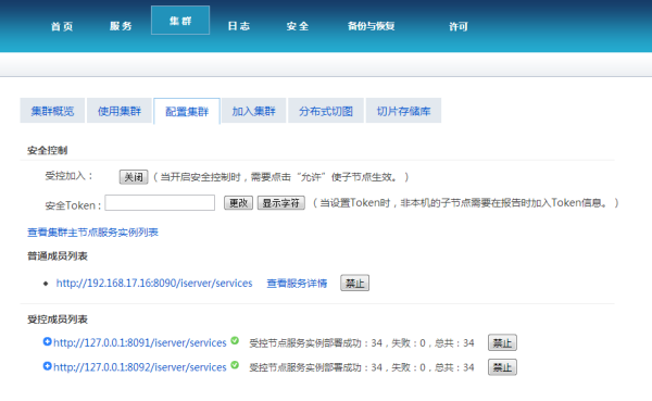 访问集群父节点的配置集群页面(http://clusterserver:8090/iserver/manager/clusterMembers),在安全控制中点击“受控加入”的开启按钮,可以设置安全 Token。开启安全控制后,在集群成员列表中,点击子节点对应的“允许”按钮,可以允许子节点加入集群,点击“禁止”按钮可以禁止子节点加入。