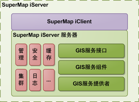 除了 GIS 功能的组成模块之外,作为企业级的 GIS 服务器,SuperMap iServer 在系统体系结构上充分体现了它的服务器能力,主要包括:集群、缓存、管理、日志等。