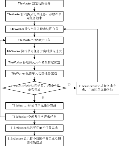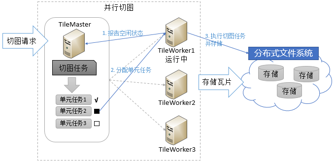7) TileWorker 端执行单元任务,切图并在切图过程中向 TileMaster 报告单元任务执行的状态,将切图结果保存到指定存储位置;
