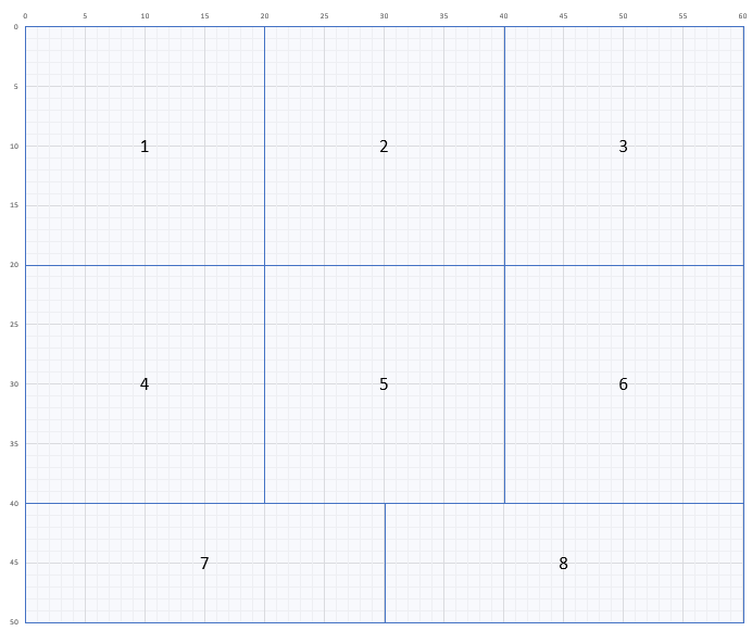 如图所示,每个小的单元格代表一张地图瓦片,如果单元切图任务的瓦片张数为20*20,则从地图左上角开始以20行*20列为单元将地图进一步划分为单元任务区。最后一部分的单元任务如果不能满足20*20,如本例中只有10行,则会将任务范围扩大至10*n≤400,且尽量按照瓦片列数均分,本例中第7、8个单元任务中瓦片数为10*30。