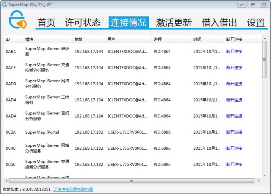 SuperMap 许可中心的“连接情况”页面显示了 SuperMap GIS 8C 系列产品许可模块在目标机器上当前被使用的详细信息。