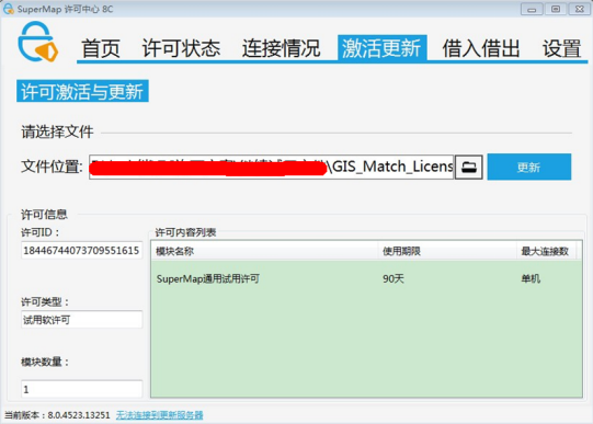 在 SuperMap 许可中心,打开“激活更新”页,浏览并选择您获得的 *.lic 或 *.lic7c 试用许可文件,然后,单击“更新”按钮,即可使试用许可生效。
