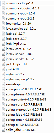 基于 jersey 自定义的定制开发时,在 tomcat 安装目录中的/webapps 目录下建一个新的文件夹名称为 custom,可将%SuperMap iPortal_HOME%\samples\code\ExtendPortal\Custom_App_Sample\WebContent 目录下的所有文件复制到 tomcat 安装目录中的 webapps 目录下,然后把%SuperMap iPortal_HOME%\webapps\iportal\WEB-INF\lib 目录下的如下图所示的这些包引入到%apache-tomcat%\webapps\custom\WEB-INF\lib 目录下。