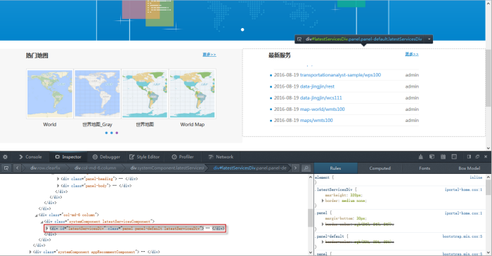 1. 按键盘的 F12 键查看首页源码文件,定位到”最新服务组件“的源码,查看对应的 DOM 元素,如:latestServicesDiv