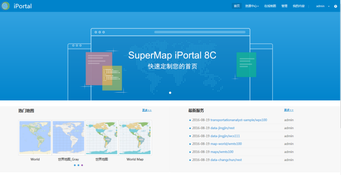 门户首页内容的定制包括:常规内容、导航设置、轮播设置、快捷链接、热门地图、最新服务等,还可以通过修改 css 文件自定义主题风格,通过修改 js 文件定制页面的 Title。