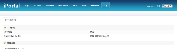 以门户管理员身份登录 SuperMap iPortal 门户首页,点击“管理”模块进入门户管理页面,在“许可”选项卡中可以查看 SuperMap iPortal 当前的许可信息。包括许可状态以及许可的相关附加信息,在附加信息中,会显示 iPortal 当前版本的可注册用户数。如下图所示: