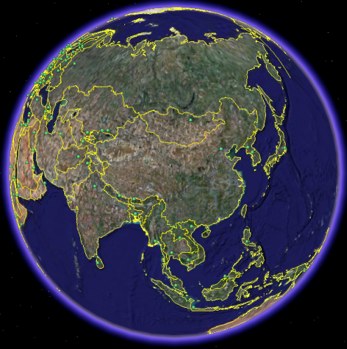 在 GoogleEarth 中访问 http://localhost:8090/iserver/services/data-world/rest/data/datasources/name/World/datasets/name/Capitals.kml,显示如下图所示:
