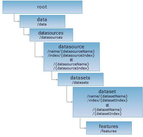 features 资源表示一个数据集中所有要素(feature)的集合。通过对 features 资源执行 GET 请求可以获取数据集中的要素列表,当数据集为点、线、面数据集、文本数据集、复合数据集或纯属性表数据集时,对 features 资源执行 POST 请求可以完成对数据集中的要素进行添加、删除或修改。