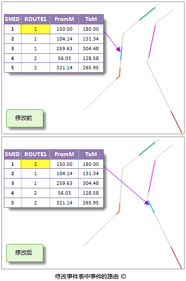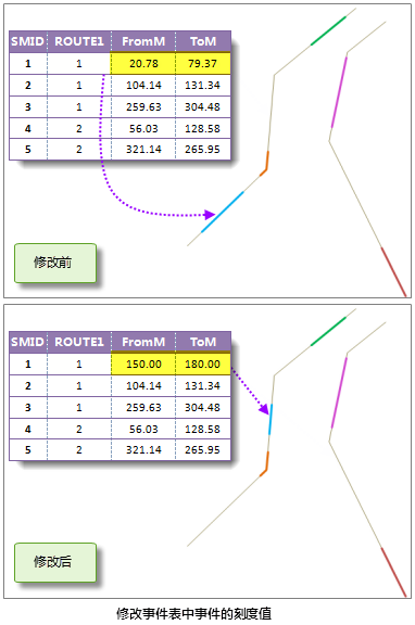 如下图所示,是生成空间数据之后 ,将对应事件表中第一条事件的起始刻度和终止刻度由(20.78 ,79.37)修改为(150.00,180.00)前后,对应空间数据中对应该事件的线的变化 ,可以看出,当事件的刻度值发生变化后,对应的空间数据也自动进行对应的修改。 如果修改后的刻度值与对应路由的 M 值不存在交集,例如,修改后起始刻度和终止刻度分别为26、60,而对应路由的 M 值范围为3到20,空间数据的几何信息不会改变;如果修改后线事件的一部分位于路由上,则对应的空间数据自动修改为只对应这一部分的数据。