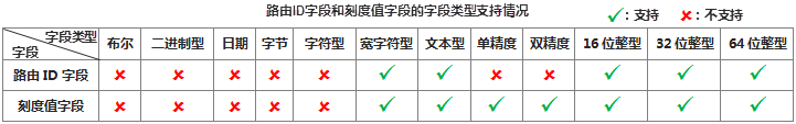 | routeIDField | String | 用于生成空间数据的路由数据集中的路由标识字段,路由标识字段支持的类型详见下表。 |