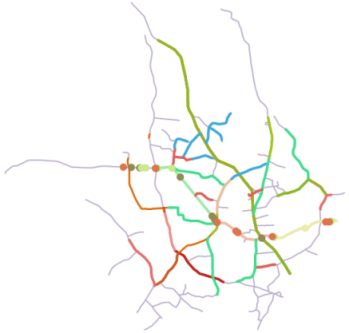 动态分段结束后事件表中的事件被定位到空间上,生成相应的点或者线图层。其中点事件对应生成点数据集,线事件表对应生成的线数据为路由数据集。生成空间数据后可以与原始路由数据(或原始线数据)叠加显示,或者制作专题图显示,并叠加于原始路由之上。下图展现了动态分段生成矢量点和线 (路由)数据后,根据其某一属性制作专题图,并叠加于原始路由之上的效果。其中淡紫色的线是原始路由数据。