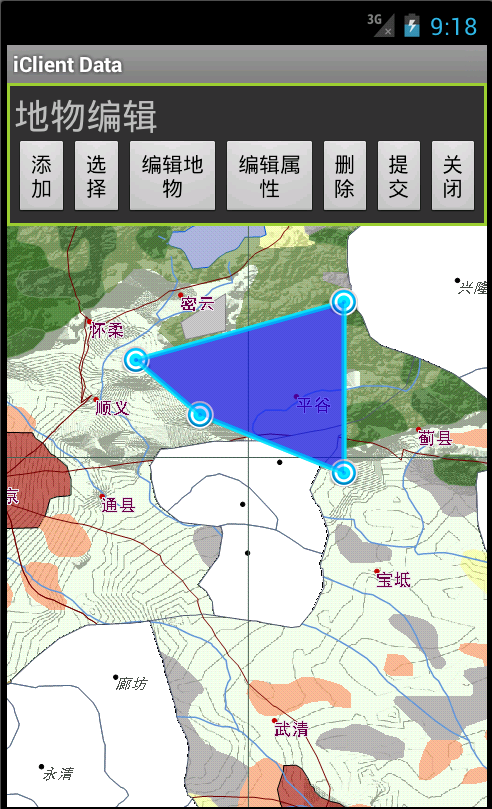 使用的地图实例地址为 /map-jingjin/rest/maps/京津地区土地利用现状图,数据分析实例地址为 /data-jingjin/rest/data。点击移动设备的菜单按钮,点击“地物编辑”,弹出“地物编辑”对话框。数据编辑的图层为“Landuse_R@Jingjin”。