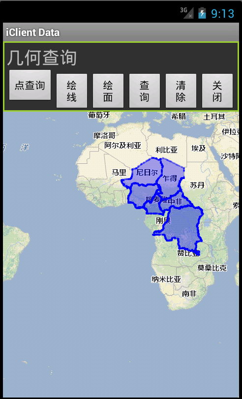 使用的地图实例地址为 /map-world/rest/maps/World,数据分析实例地址为 /data-world/rest/data。点击移动设备的菜单按钮,可选择“ID查询”、“几何查询”、“缓冲区查询”、“SQL查询”等菜单。