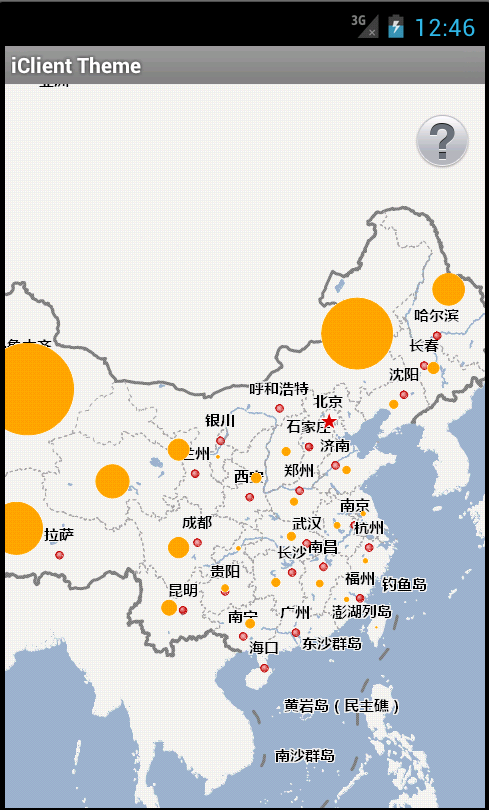 使用地图实例地址为/map-china400/rest/maps/China。点击移动设备的菜单按钮,点击“创建专题图”按钮,按照“SMAREA”字段的常量分级模式创建专题图,效果如下图: