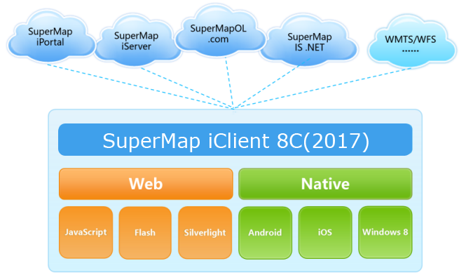 SuperMap iClient 8C 系列产品:SuperMap iClient 8C 提供多个针对不同开发平台的客户端软件开发工具包,包括五套二维开发包和二套三维开发包,打造二维三维一体化的客户端系统。